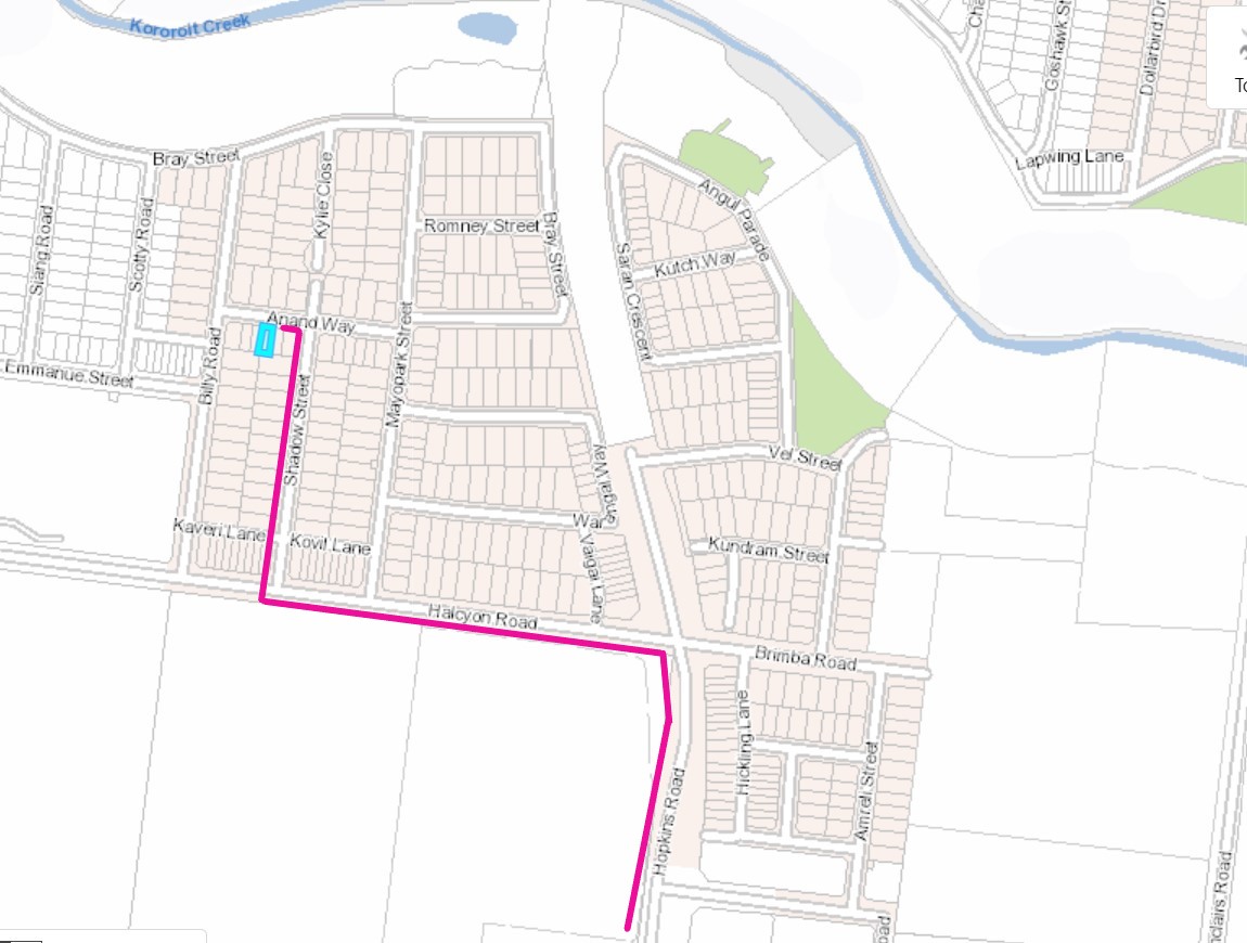 * Directions: Hopkins Road > Halcyon Road > Shadow Street > Anand Way