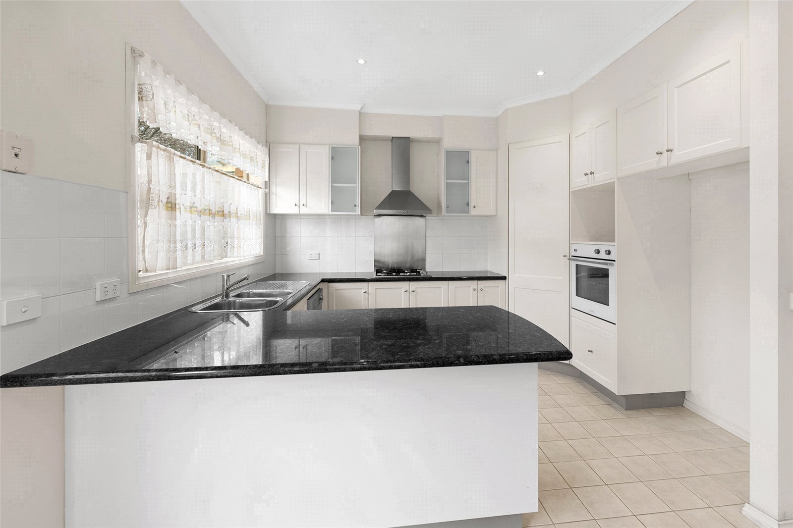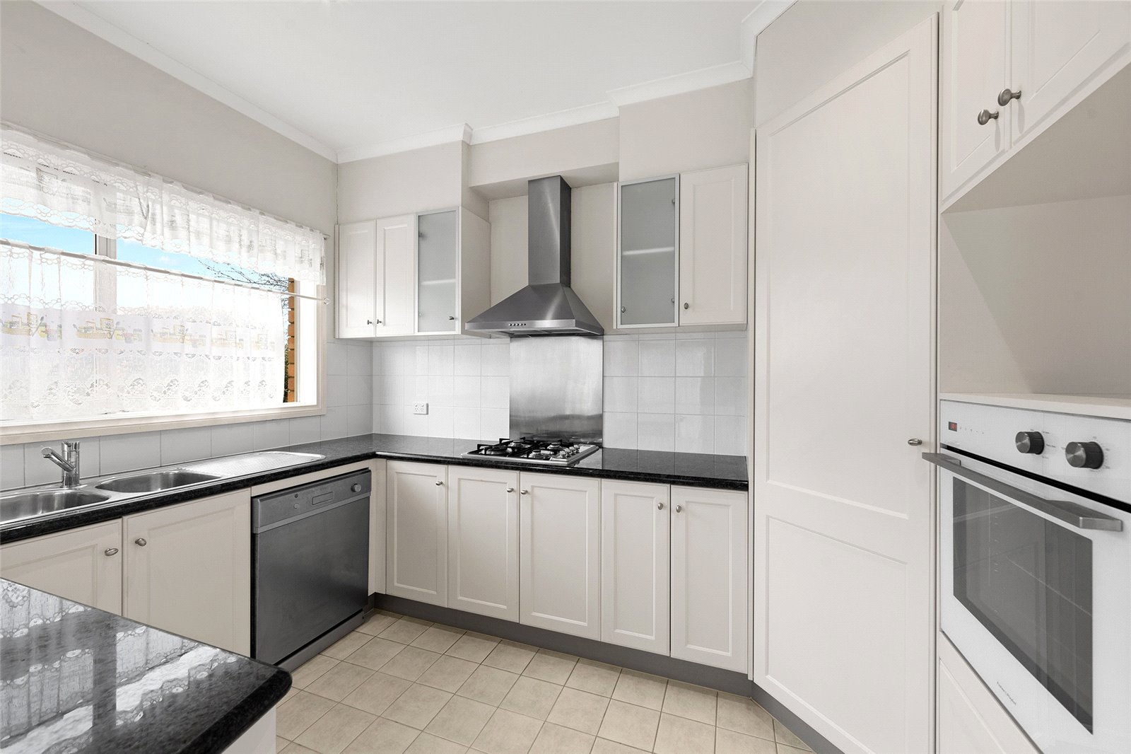 - Kitchen with black contrasting bench-tops and stainless-steel appliances such as gas cooktop, oven and dishwasher