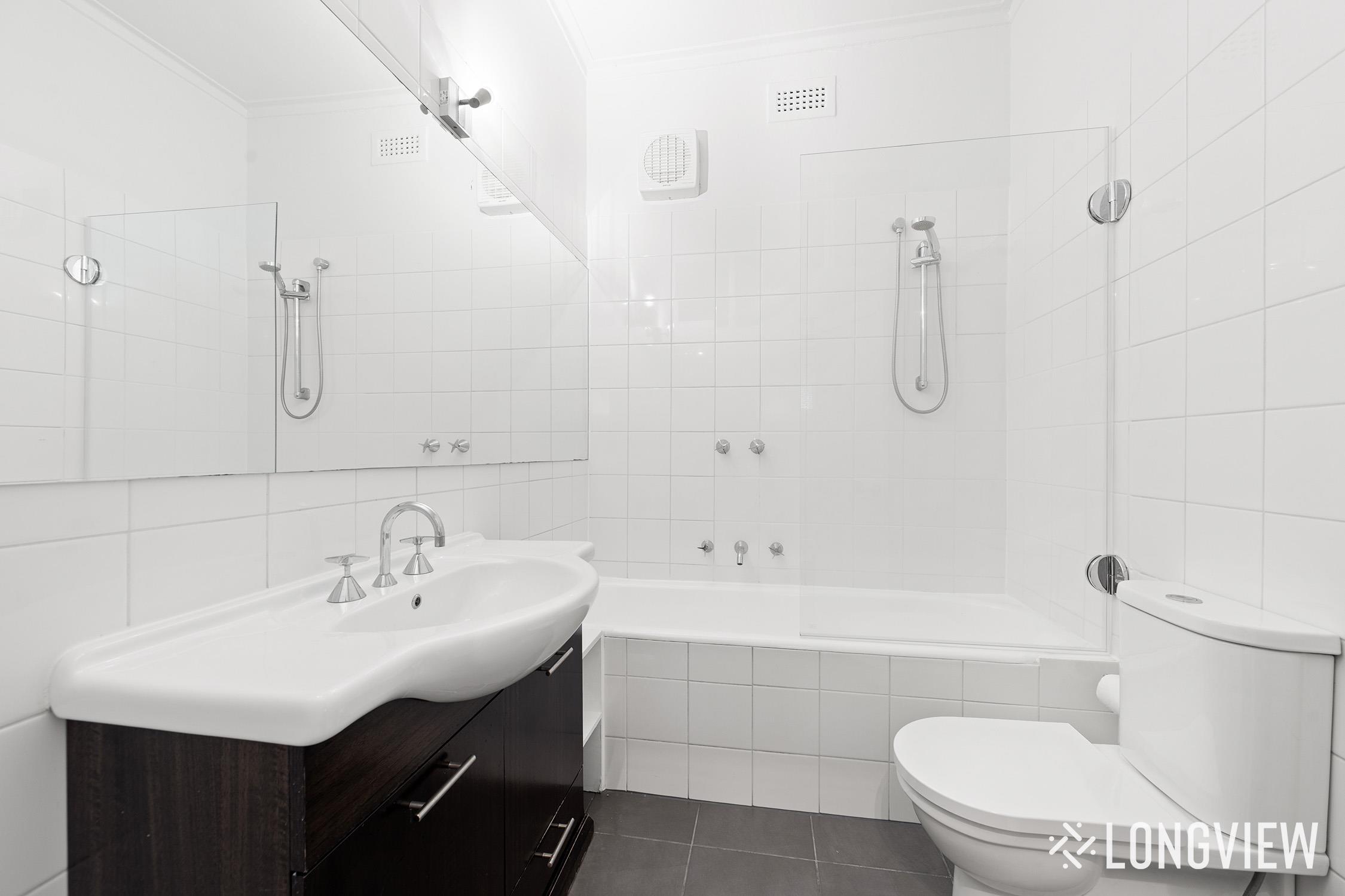 - Bathroom with shower over bath and vanity storage