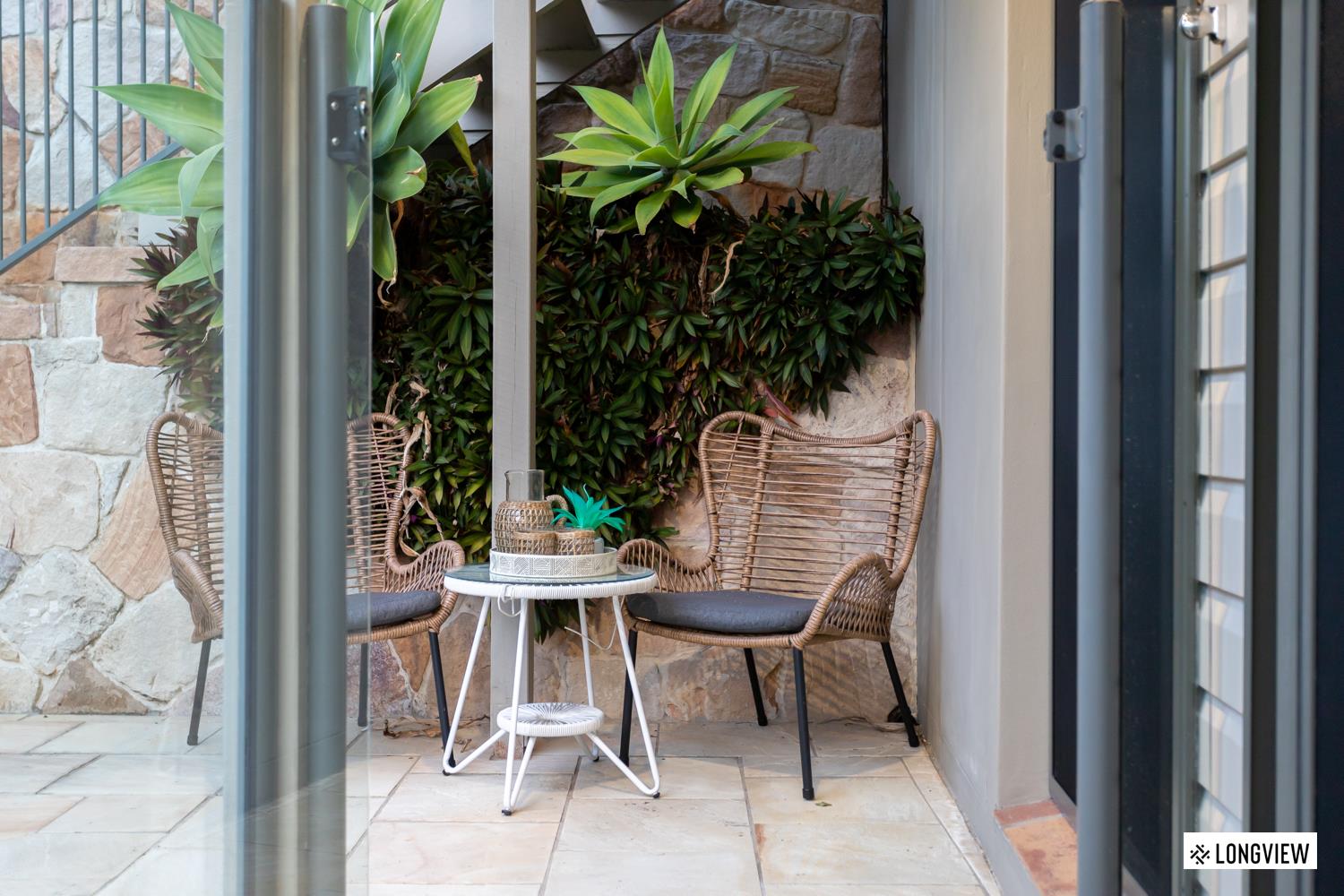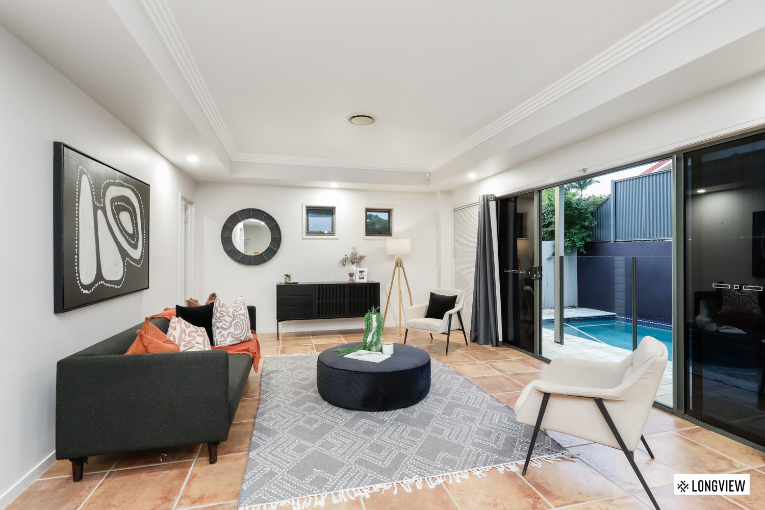 - Alfresco entertaining area looking out to the pool with water feature & manicured gardens