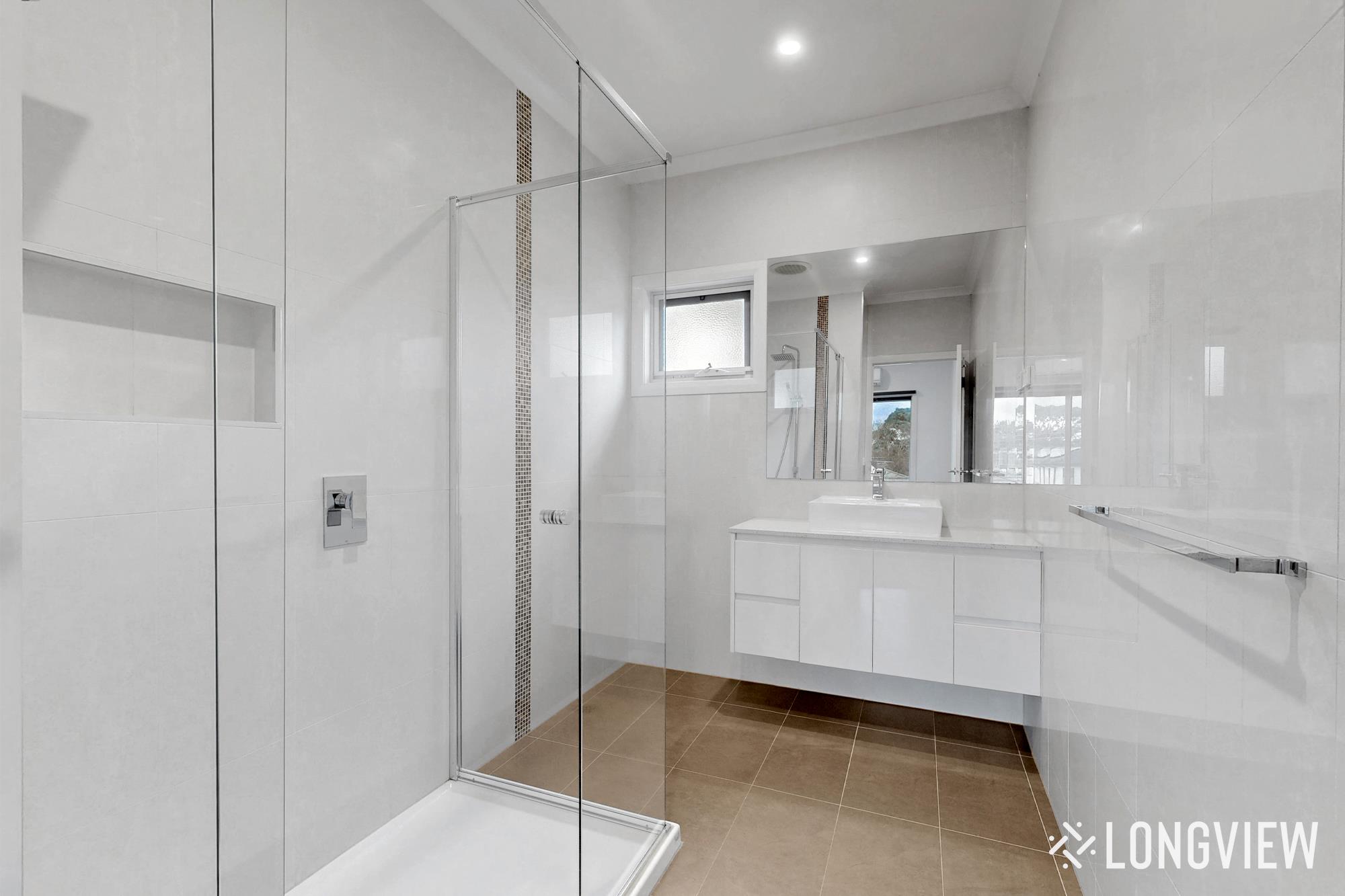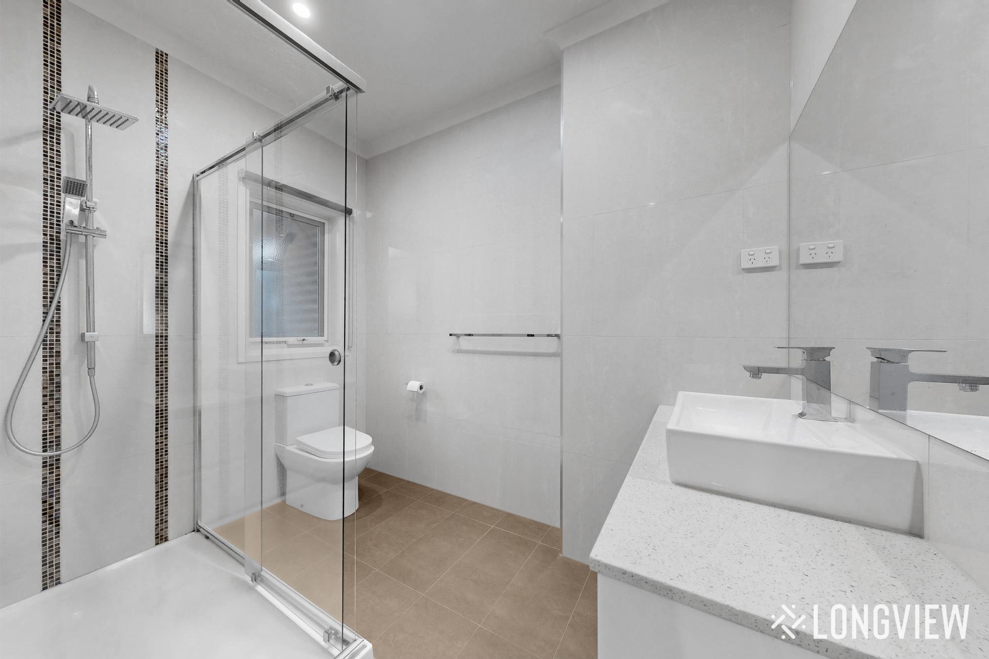 - Luxe ensuite with floor-to-ceiling tiles, stone vanity, and semi-frameless glass shower