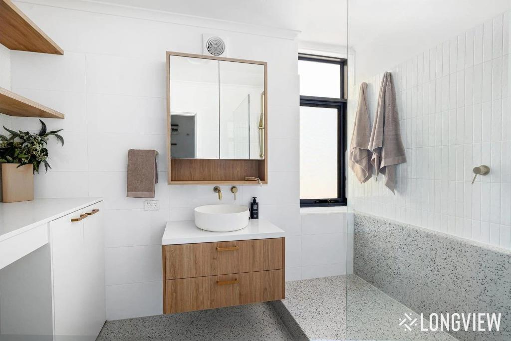 - Bathroom with stylish terrazzo floor. and separate fitted laundry zone