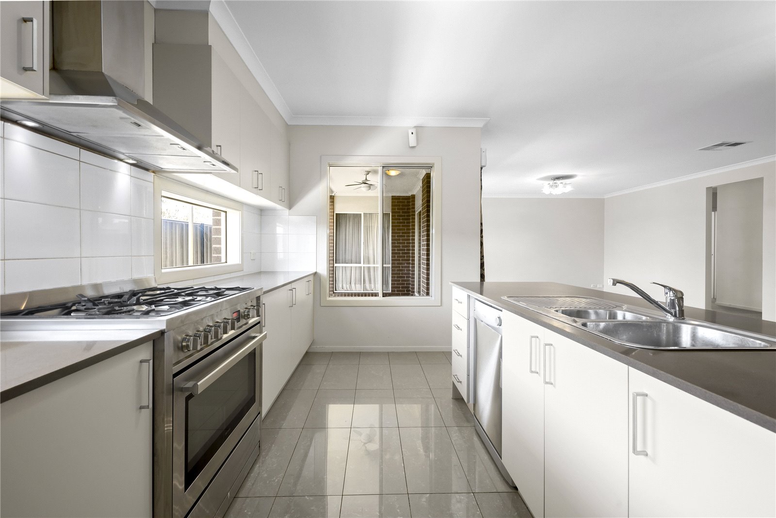 - Tiled kitchen with stainless steel appliances including dishwasher, stone bench top and walk in pantry