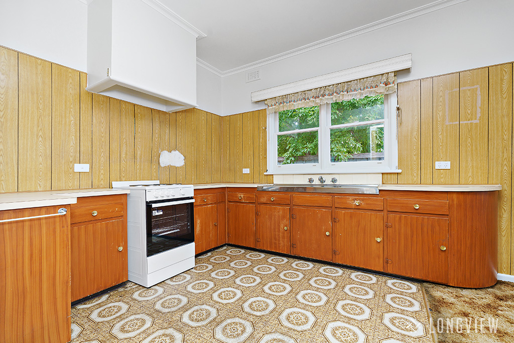 - Kitchen with timber cabinetry, electric cooking and adjacent meals area