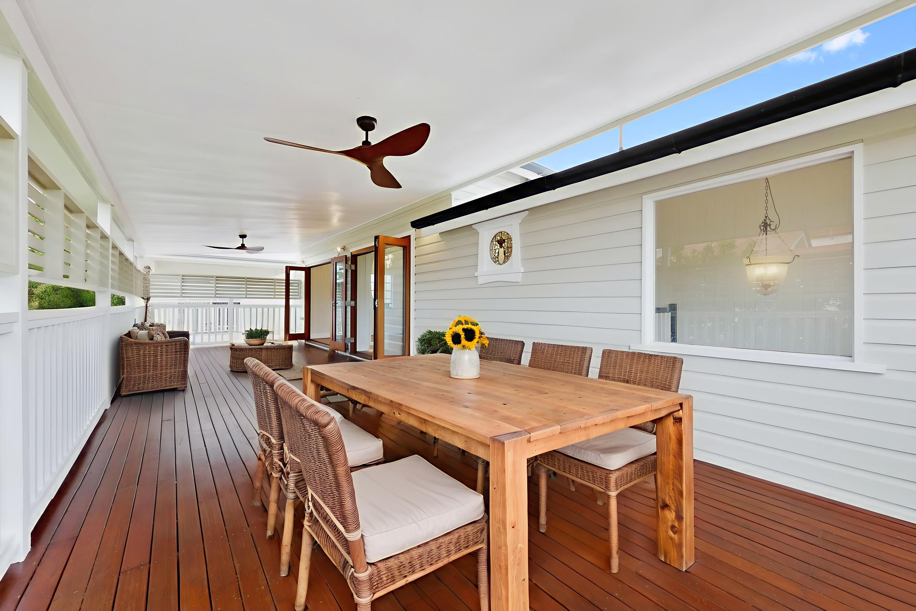 Expansive covered deck flowing from the dining area — perfect for outdoor living and entertaining